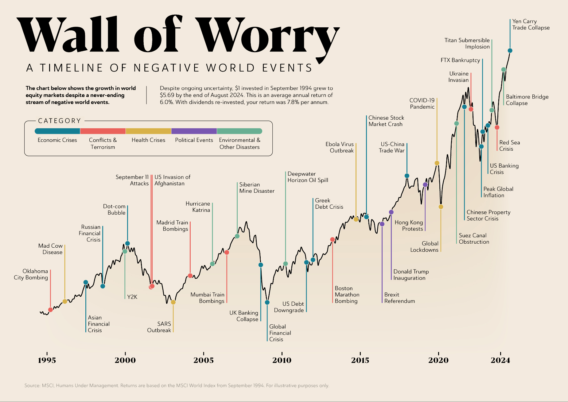 So even if my portfolio fell from £1m to £750,000, it’s not something to lose sleep over. All I need to do is look at the Wall of Worry and remember how resilient the stock markets are.